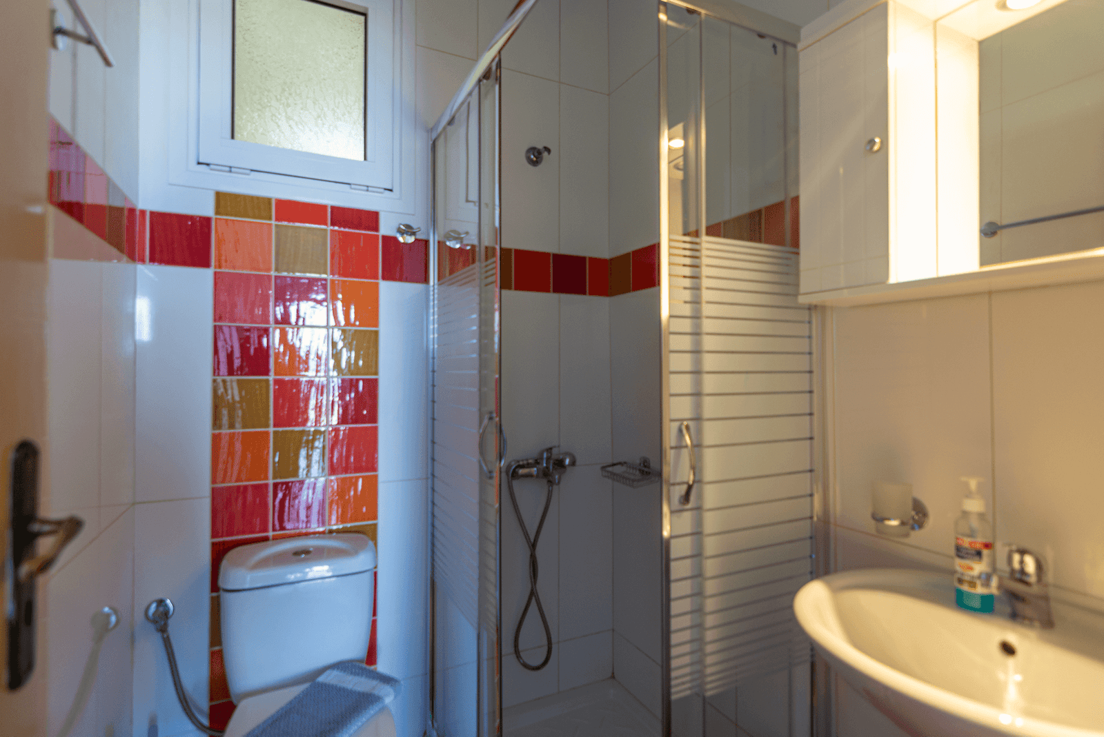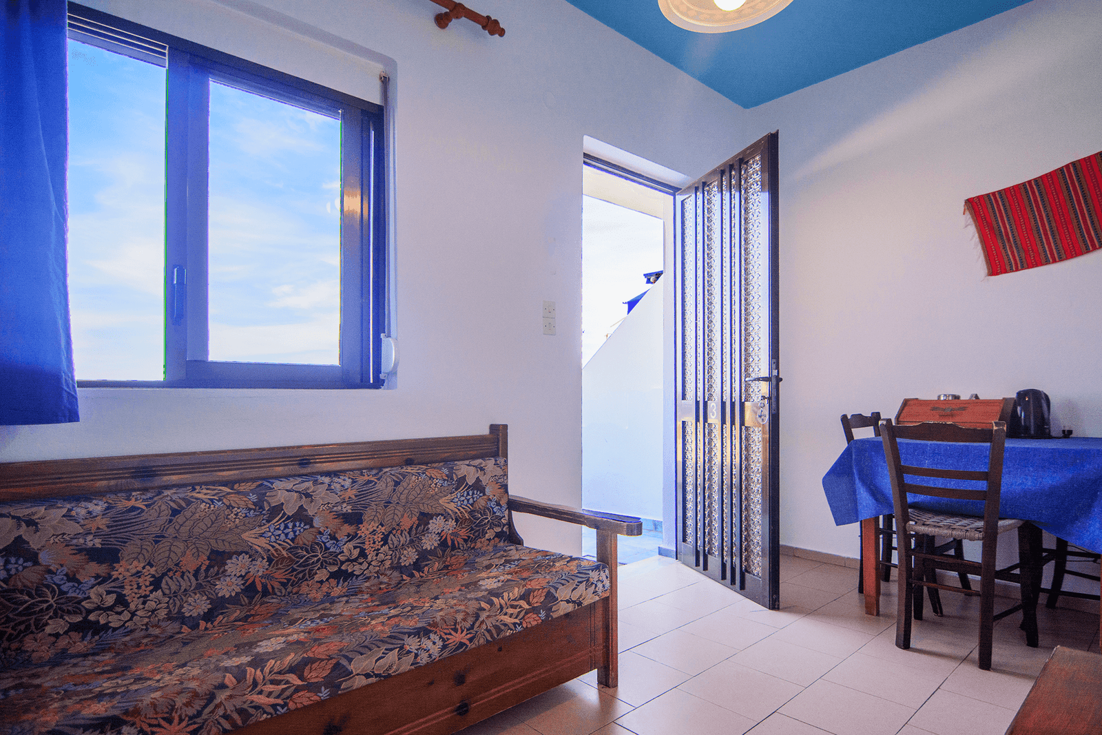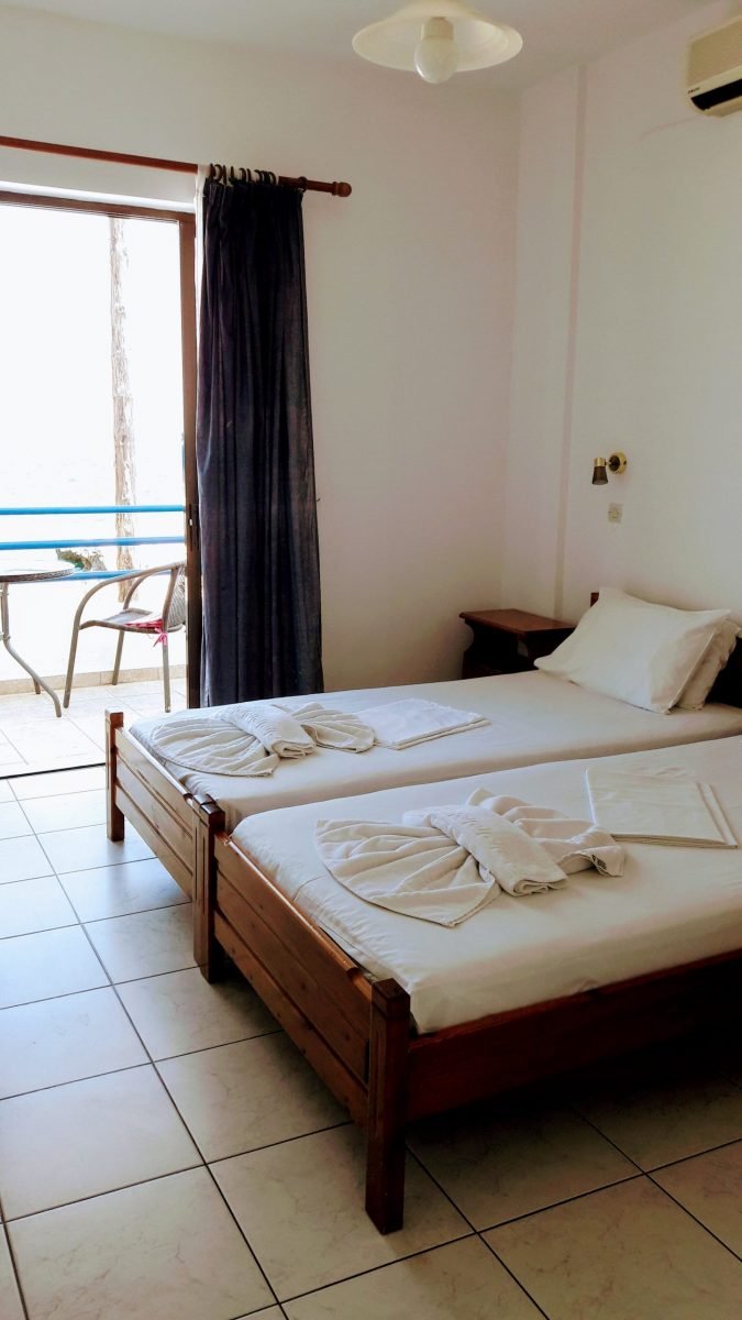 A studio is one-room-with-everything plus the toilet/shower and sleeps 2, some studios are large enough for a baby bed or pull out bed to be added. There are 5 sea facing studios and 1 double bed studio with no sea view – it has a small balcony with afternoon sun.