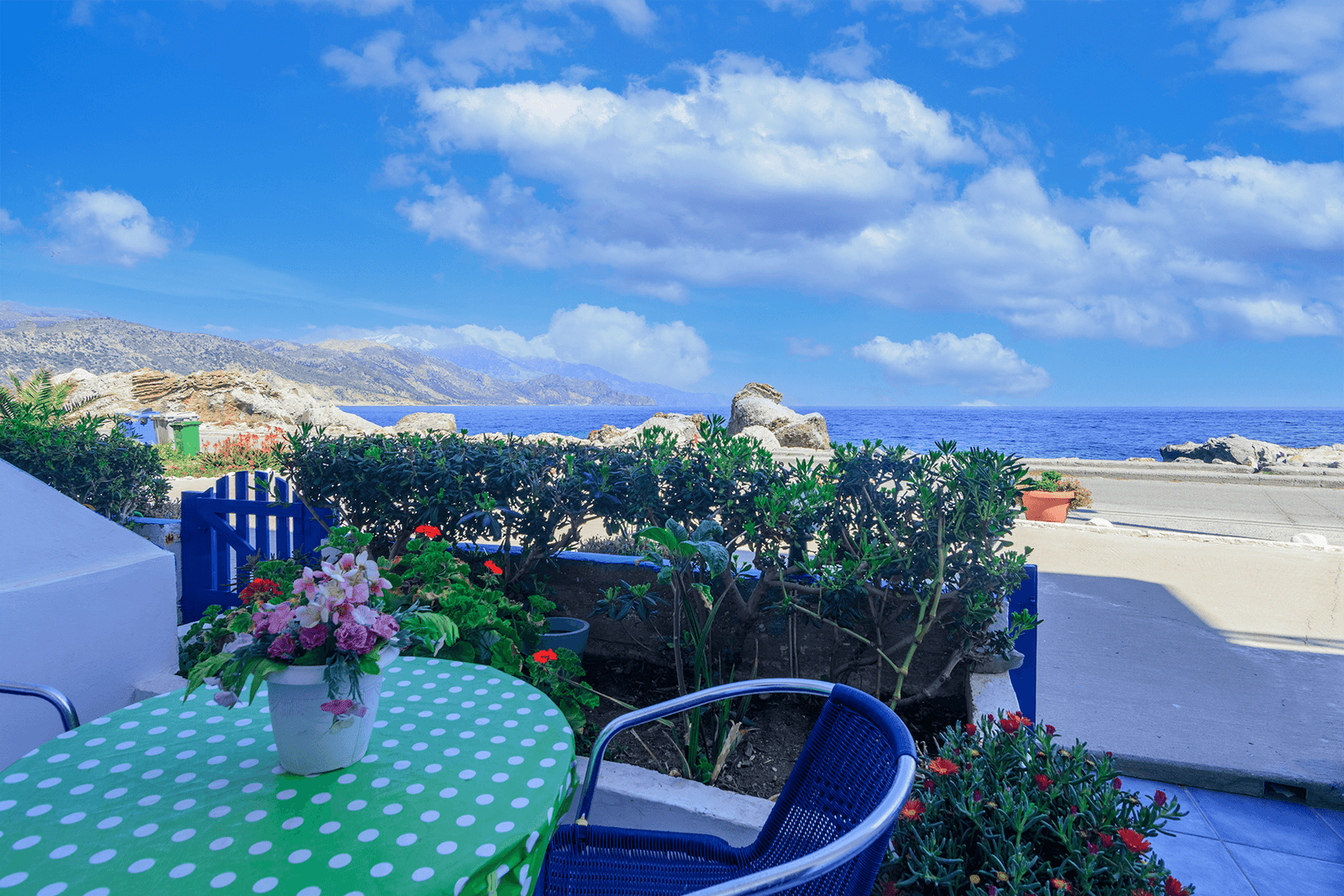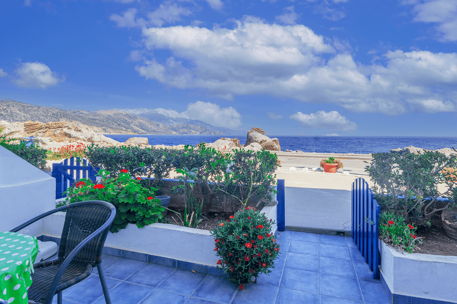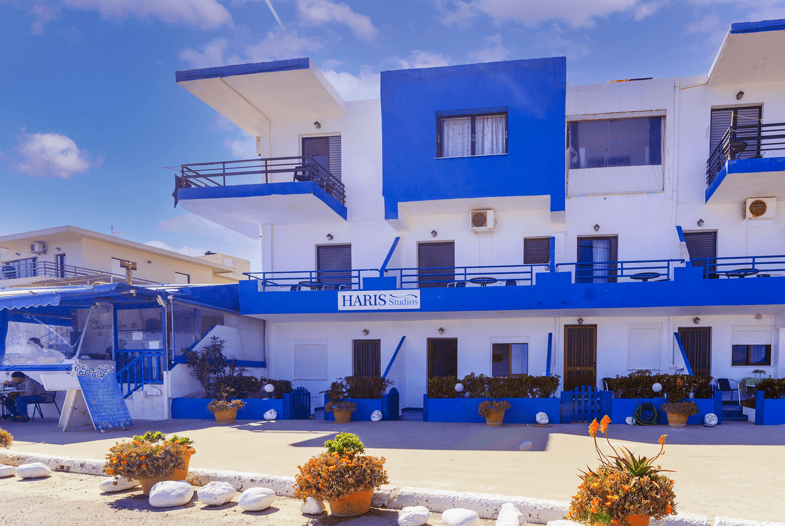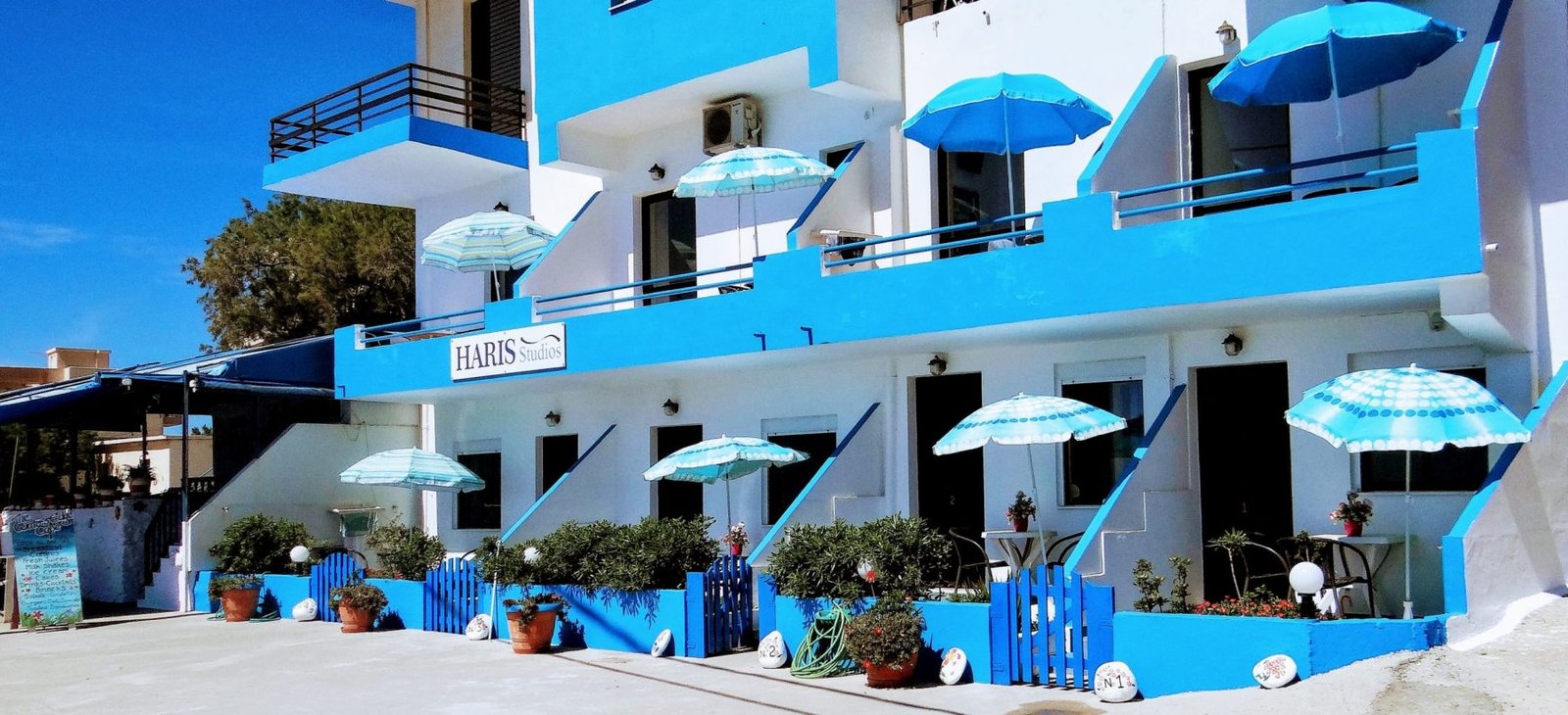 You will find us in the ‘old town’, known locally as Gavdiotika, named after the many settlers who came here early last century from the island of Gavdos to make a new life and build their homes. Many of those single storey stone houses looked out to their birthplace and a few of them remain. It’s easy to see why they would want to settle on this rocky shoreline – the mystical island of Gavdos reveals itself when weather conditions permit, a view that can be enjoyed from the first floor balconies or ground floor terraces at Haris Studios