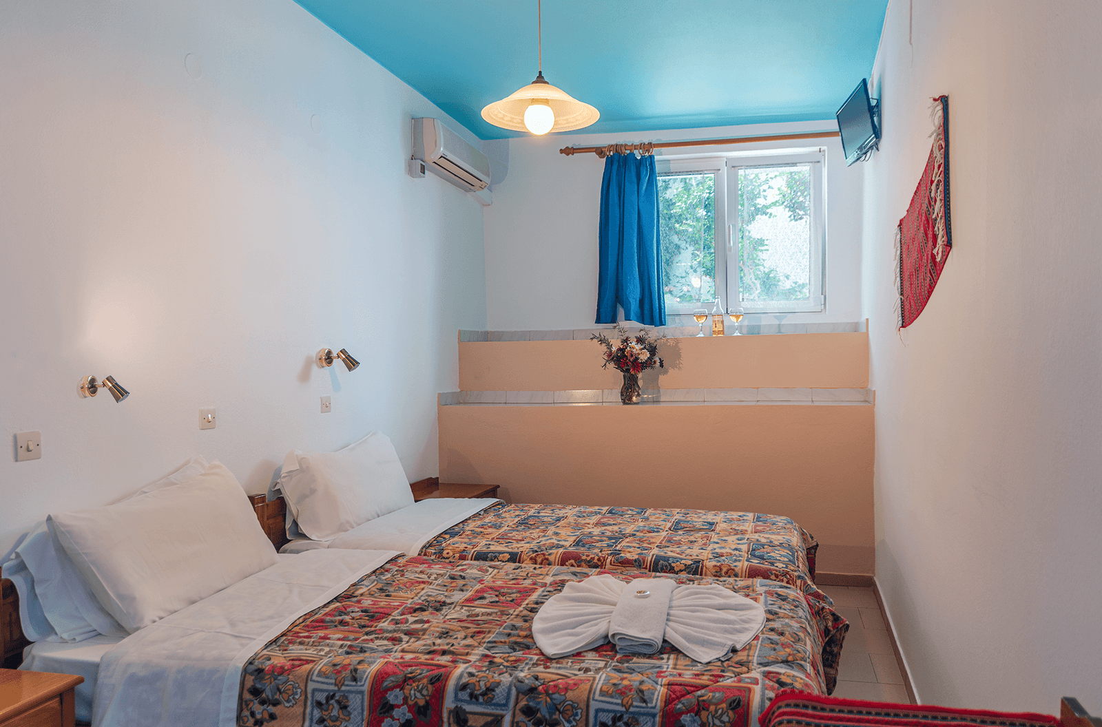 All the studios and apartments at Haris Studios have a small kitchen with 2 ring hot plate & refrigerator, dining area, toilet /shower, hair dryer, air-conditioning, flat screen tv, wi-fi. In addition there are washing machines for hire, a book corner, swimming pool, garden and roof terrace at our other building – Studios Yiorgos..