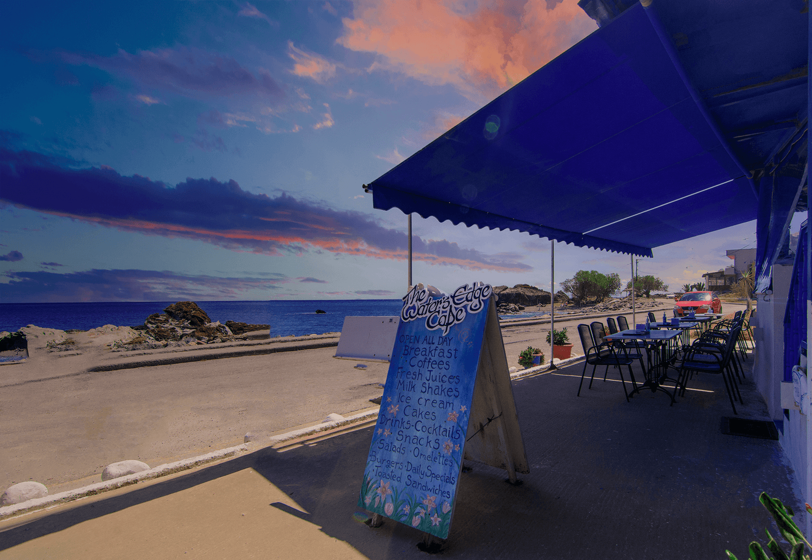 Our café – Meltemi café – is adjacent and we’re happy to provide room service when requested. A simple breakfast (Fresh Orange Juice, Tea/Coffee, Boiled Egg, Toast, Butter and Marmalade) can be added to the cost of your accommodation, 4.50€ per person. If you prefer to have a selection of different breakfast items during your holiday take a look at the Water’s Edge Cafe page for an idea of what’s on offer, no need to book in advance, we are there every day…and all day – no time limit on when breakfast is available!